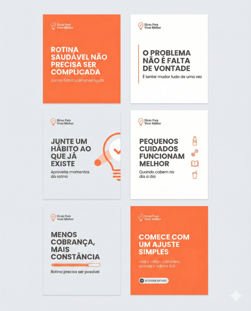 O principal cuidado é não tentar fazer tudo de uma vez. Uma única combinação simples já é suficiente para começar. Rotina saudável não nasce da perfeição, nasce da repetição possível.