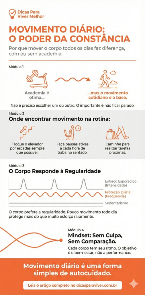 Cuidar do corpo passa por se movimentar com regularidade. Com academia ou sem ela, o que sustenta a saúde é a constância e a atenção ao próprio corpo.